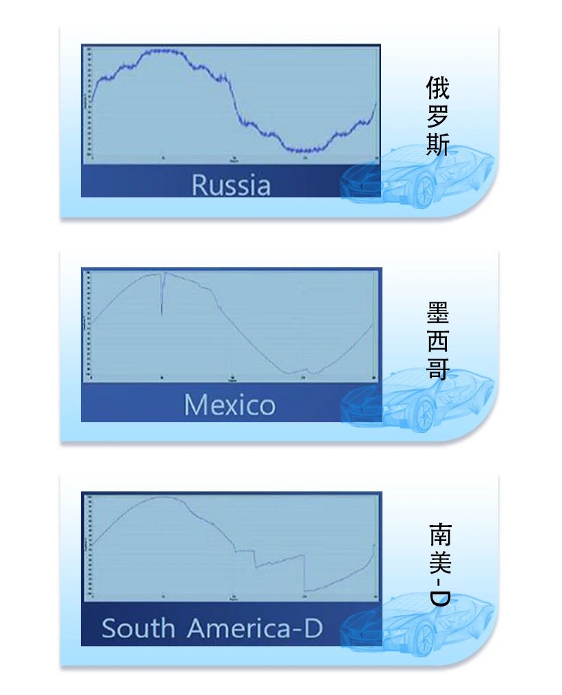 深圳某新能源車(chē)企為了推進(jìn)全球化市場(chǎng),需要對(duì)OBC進(jìn)行多國(guó)電網(wǎng)適應(yīng)性測(cè)試,但俄羅斯、墨西哥、南非等國(guó)家測(cè)試工況較為嚴(yán)苛,普通的測(cè)試電源無(wú)法編輯較為復(fù)雜的電網(wǎng)波形。以下為部分標(biāo)準(zhǔn)波形: