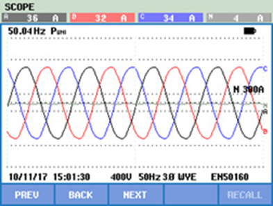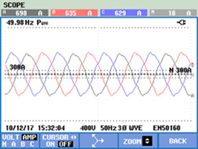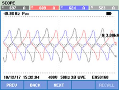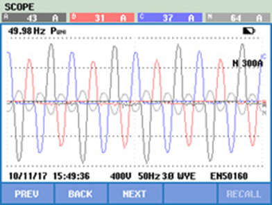 從測試數(shù)據(jù)看出,變壓器低壓側(cè)電流波形發(fā)生嚴(yán)重畸變,中線電流也很大;各樓層配電箱中線電流達(dá)到相線兩倍,已經(jīng)觸及中性線電纜載流限制,存在嚴(yán)重安全隱患。